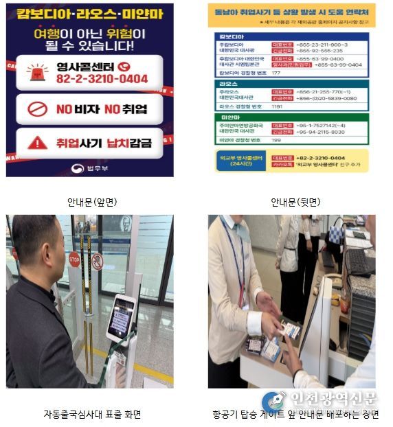 [인천광역신문] 관리자 기자 | 법무부는 10월 17일부터 시행 중인 캄보디아로 출국하는 국민 대상으로 출국단계 취업사기 예방 안내 조치를 . 10월 27일부터 라오스와 미얀마로 출국하는 국민까지 확대 시행했다고 밝혔다.