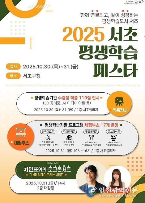 [인천광역신문] 최훈 기자 | 서울 서초구는 지역 내 평생학습기관들의 성과를 공유하고 주민들의 평생학습 문화를 확산하기 위해 오는 30일, 31일 이틀간 ‘2025 서초 평생학습 페스타’를 개최한다고 밝혔다.