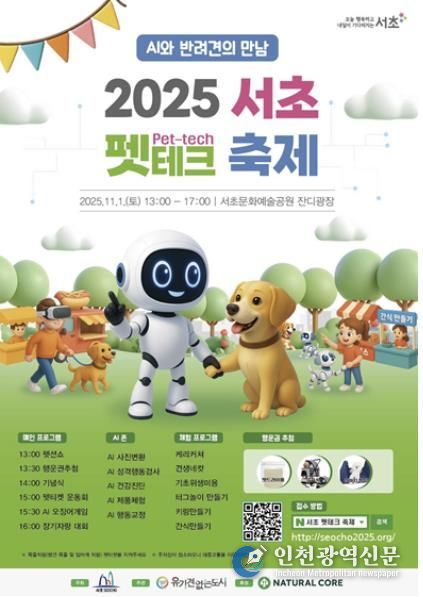 [인천광역신문] 최훈 기자 | 서울 서초구는 오는 11월 1일, 오후 1시부터 5시까지 서초문화예술공원 잔디광장에서 ‘2025 서초 펫테크 축제’를 개최한다고 밝혔다.