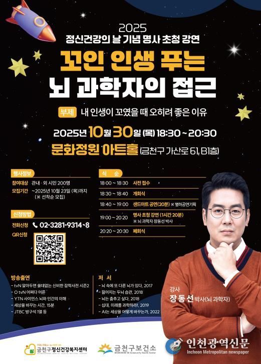 [인천광역신문] 최훈 기자 | 금천구는 ‘정신건강의 날(10월 10일)’을 기념하며 30일 독산동에 위치한 문화정원 아트홀에서 뇌과학자 장동선 박사 초청강연과 부대행사들을 개최한다고 밝혔다.