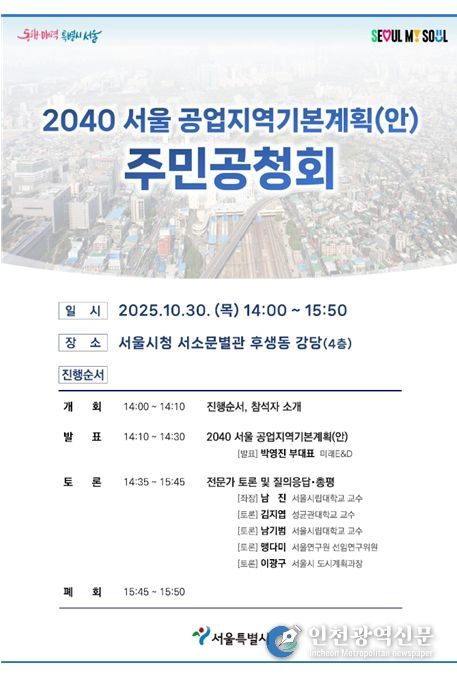 서울시는 산업구조 변화와 도심 내 제조업 쇠퇴에 대응하여 공업지역을 새로운 성장 거점으로 재편하기 위한 방향을 공유하고 다양한 의견을 듣고자 공청회를 10월 30일 개최한다.