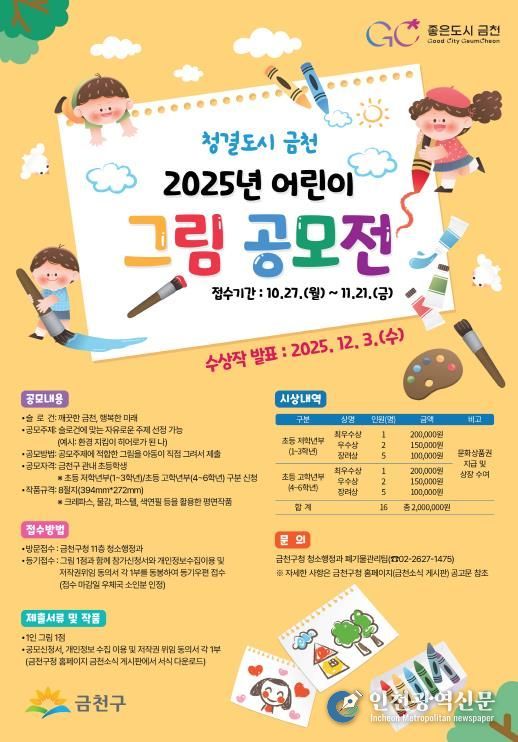 [인천광역신문] 최훈 기자 | 금천구는 10월 27일부터 11월 21일까지 ‘청결도시 금천 어린이 그림 공모전’을 개최한다고 밝혔다.