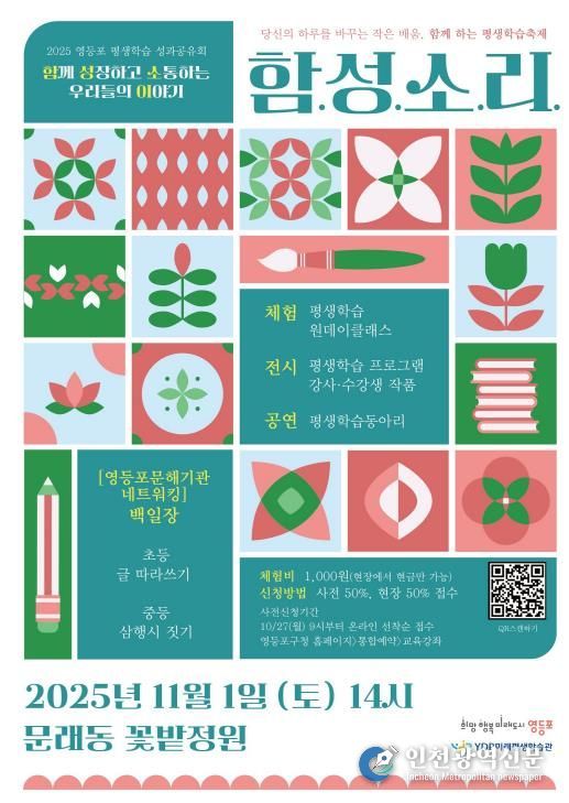 [인천광역신문] 최훈 기자 | 영등포구가 오는 11월 1일 문래동 꽃밭정원 일대에서 ‘평생학습 성과공유회 함.성.소.리.’ 를 개최한다고 밝혔다.