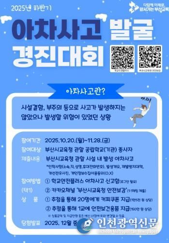[인천광역신문] 관리자 기자 | 부산광역시교육청은 지난 20일부터 다음달 28일까지 관내 학교(기관) 근로자를 대상으로 ‘하반기 아차사고 발굴 경진대회’를 개최한다고 29일 밝혔다.