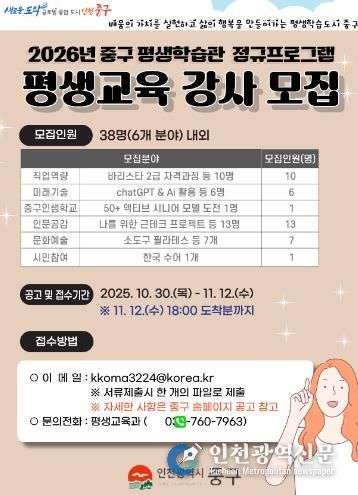 [인천광역신문] 최예준 기자 | 인천시 중구는 오는 2026년 한 해 동안 중구 평생학습관에서 정규 프로그램을 담당할 전문성과 열정을 갖춘 전문 강사 38명을 공개 모집한다고 31일 밝혔다.