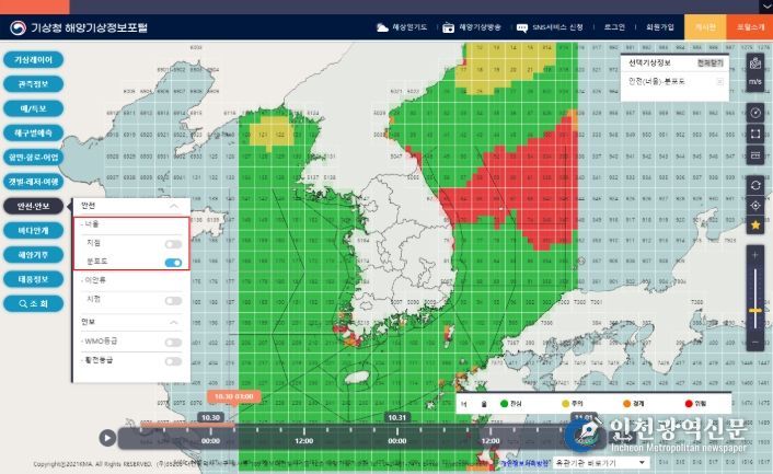 [인천광역신문] 관리자 기자 | 기상청은 10월 31일부터 동해 망상해변, 속초 영랑동 해안도로 등 45개 해안 지점에 대해 제공해 왔던 너울 위험 예측정보를 우리나라 주변 해상 전체로 확대하여 제공한다고 밝혔다.