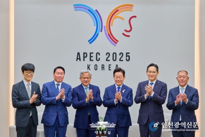 [인천광역신문] 관리자 기자 | 이재명 대통령은 10월 31일 오후 2시 경주 APEC 정상회의를 계기로 방한한 젠슨 황 엔비디아 대표를 만나, 대한민국 AI 인프라를 비롯한 생태계 전반의 혁신 방안에 대해 의견을 교환했다. 이 자리에는 삼성전자 이재용 회장, SK 최태원 회장, 현대차그룹 정의선 회장, 네이버 이해진 의장이 함께했다.