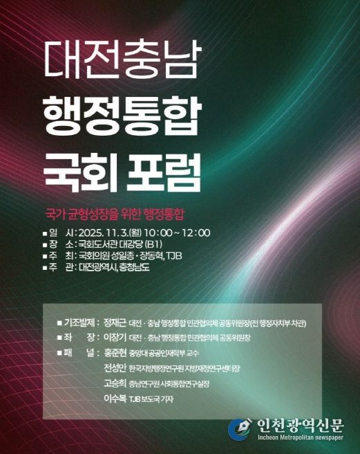 [인천광역신문] 관리자 기자 | ‘대전충남특별시 설치 및 경제과학수도 조성을 위한 특별법’이 국회에 발의된 가운데, 행정통합에 대한 국민 공감대 확산을 위한 공론의 장이 펼쳐졌다.
