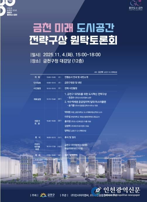 [인천광역신문] 최훈 기자 | 금천구는 4일 오후 3시 금천구청사 12층 대강당에서 ‘금천의 미래 도시공간 전략구상 계획 수립을 위한 원탁토론회’를 연다고 밝혔다.
