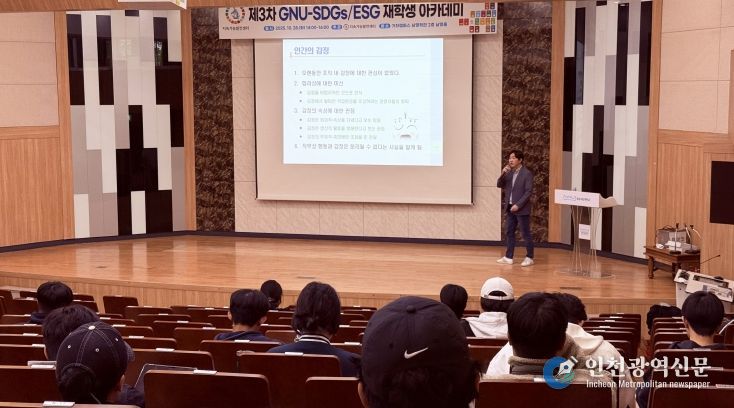 [인천광역신문] 관리자 기자 | 경상국립대학교 지속가능발전센터(센터장 김영철 회계세무학부 교수)는 10월 28일 가좌캠퍼스 남명학관에서 ‘개인의 행복과 조직의 성공을 위한 지속가능한 리더십’이라는 주제로 ‘제3차 GNU-SDGs ESG 재학생 아카데미’를 개최했다.