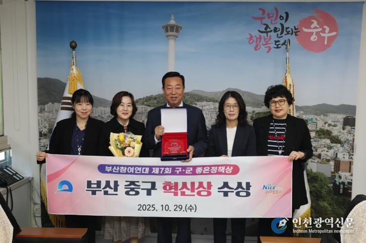 [인천광역신문] 관리자 기자 | 부산 중구는 지난 29일 부산참여연대 강당에서 개최된 '제7회 구·군 좋은정책상'시상식에서 ‘선박화물 검수원 양성 사업’으로 ‘혁신상’을 수상했다.