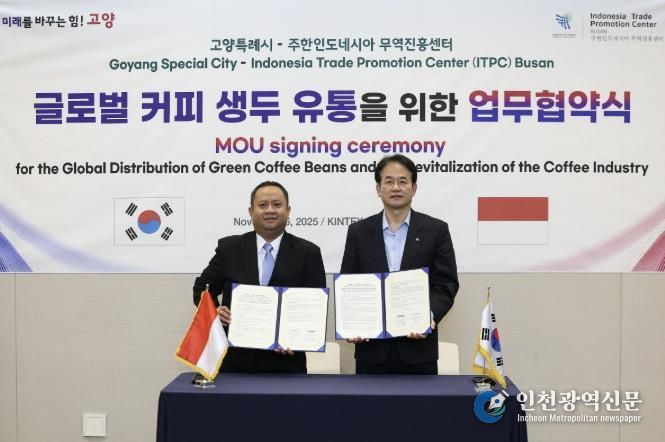 [인천광역신문] 관리자 기자 | 고양특례시는 지난 6일, ‘2025 카페·베이커리페어 시즌2’가 열리고 있는 킨텍스에서 주한인도네시아 무역진흥센터(ITPC 부산)와 ‘글로벌 커피 생두 유통 협력 협약’을 체결했다.