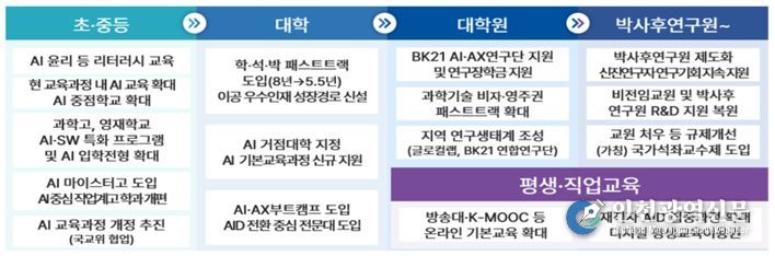 초‧중등 학생‧학부모 등을 대상으로 인공지능(AI) 교육을 실시하는 인공지능(AI) 교육지원센터를 2026년 3개 교육청에 우선 설립하고, 2028년까지 전국 17개 시‧도교육청 전체에 확대할 계획이다. 시‧도교육청-대학-기업이 함께 학교 인공지능(AI) 교육을 지원하도록 협력 체계 구축을 지원하며, 특히 학생들에게 다양한 인공지능(AI) 진로체험 기회를 제공할 예정이다.