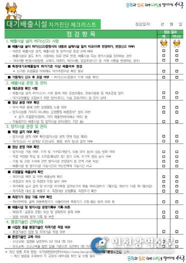 [인천광역신문] 최예준 기자 | 인천 서구는 관내 환경오염물질 배출사업장의 자율적인 환경관리 역량을 강화하고, 환경오염 사고를 예방하기 위해 '자가진단 체크리스트'를 배부한다고 밝혔다.