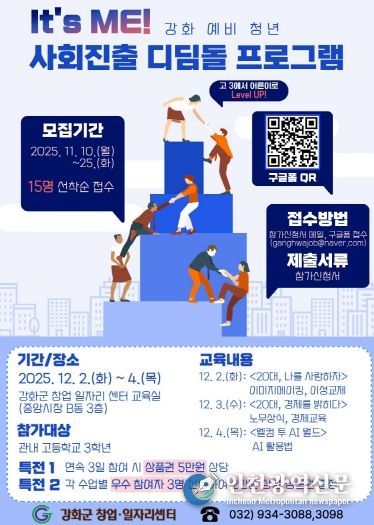 프로그램은 강화군 창업·일자리센터 교육실에서 진행되며, 오는 12월 2일부터 4일까지 3일간 다양한 강의와 실습으로 채워질 예정이다.