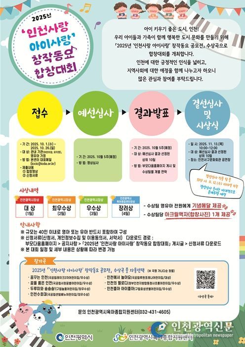 [인천광역신문] 최예준 기자 | 인천광역시는 11월 13일 서구문화회관 공연장에서 열린 '2025년 인천사랑 아이사랑 창작동요 합창대회'가 영유아와 가족, 보육교직원 등 500여 명이 함께한 가운데 성황리에 마무리됐다고 밝혔다.
