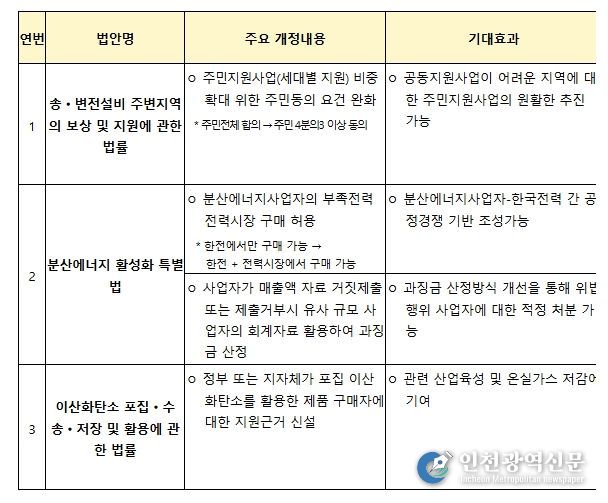 [인천광역신문] 관리자 기자 | 기후에너지환경부는 △‘송‧변전설비 주변지역의 보상 및 지원에 관한 법률’, △‘분산에너지 활성화 특별법’ 등 3개 법 개정안이 11월 13일 국회 본회의를 통과했다고 밝혔다. 개정안별 주요내용은 다음과 같다.