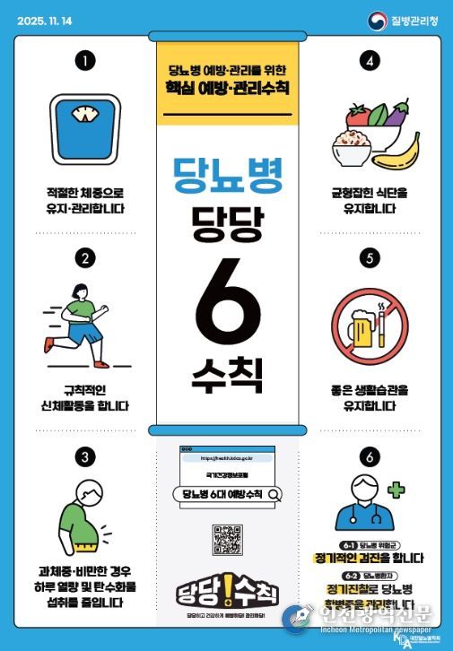 [인천광역신문] 관리자 기자 | 질병관리청은 세계 당뇨병의 날을 맞아, 6대 당뇨병 예방관리수칙 및 수칙별 실천지침을 발표하고, 생활 속 실천을 통한 건강생활 습관 형성의 중요성을 당부했다.
