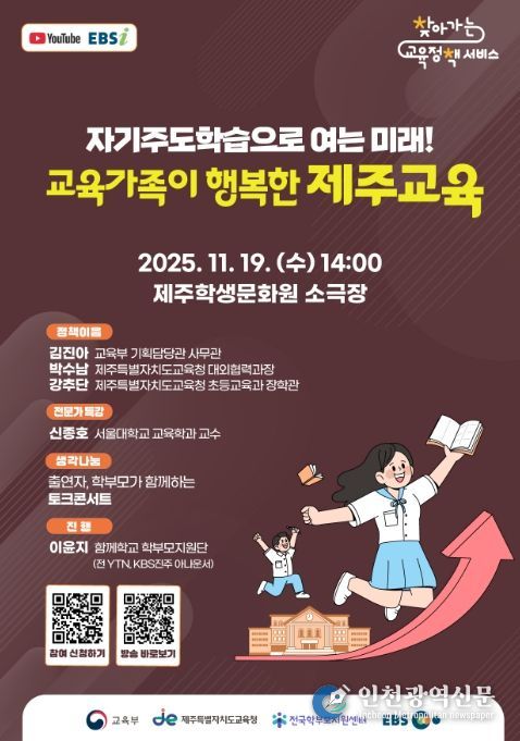 [인천광역신문] 관리자 기자 | 제주특별자치도교육청은 19일 오후 2시 제주학생문화원 소극장에서 보호자를 대상으로 ‘자기주도학습으로 여는 미래’를 주제로 찾아가는 교육정책 서비스를 개최한다.