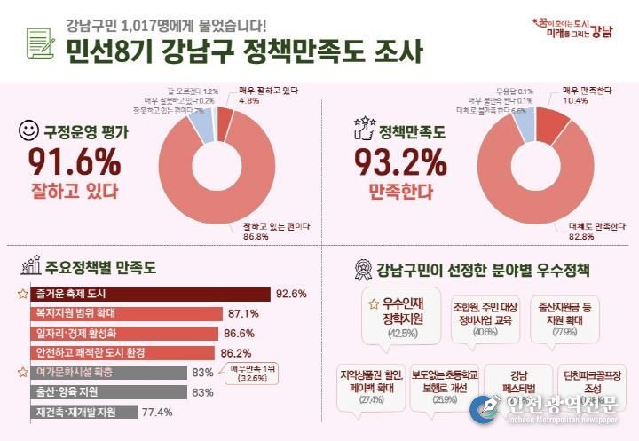 [인천광역신문] 기자 | 꿈이 모이는 도시, 미래를 그리는 강남구 정책 만족도 조사에서 구정 운영에 대한 긍정 평가가 91.6%에 달하는 것으로 나타났다. 10명 중 9명이 “잘하고 있다”고 평가한 것이다. 특히 정책 전반에 대한 만족도는 93.2%로, 주민 체감도가 높은 생활 밀착형 정책들이 구정 신뢰도를 견인하고 있음을 보여줬다. 가장 성과를 내고 있다고 생각하는 분야는 교육·보육(23.1%), 최우선으로 추진할 분야로 경제·일자리(30.4%)를 꼽았다.