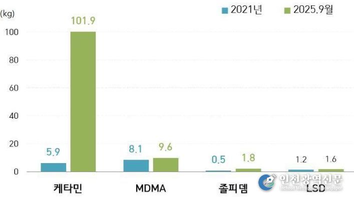 이는 약 232만 명이 동시 투약할 수 있는 양으로, 특히 2025년 1월부터 9월까지의 적발량(115.9kg)이 2024년 전체 적발량(79.9kg)을 초과하여 가파른 증가세를 보이고 있다.