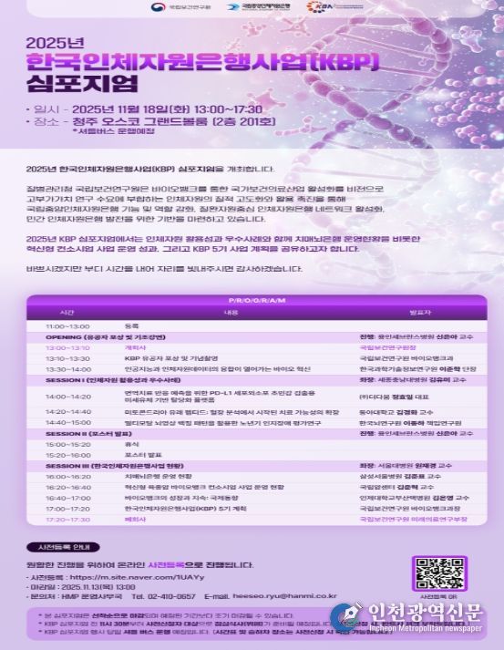 [인천광역신문] 관리자 기자 | 질병관리청 국립보건연구원(원장 직무대리 김원호)은 2025년 11월 18일「2025년도 한국인체자원은행사업(KBP) 심포지엄」을 개최한다