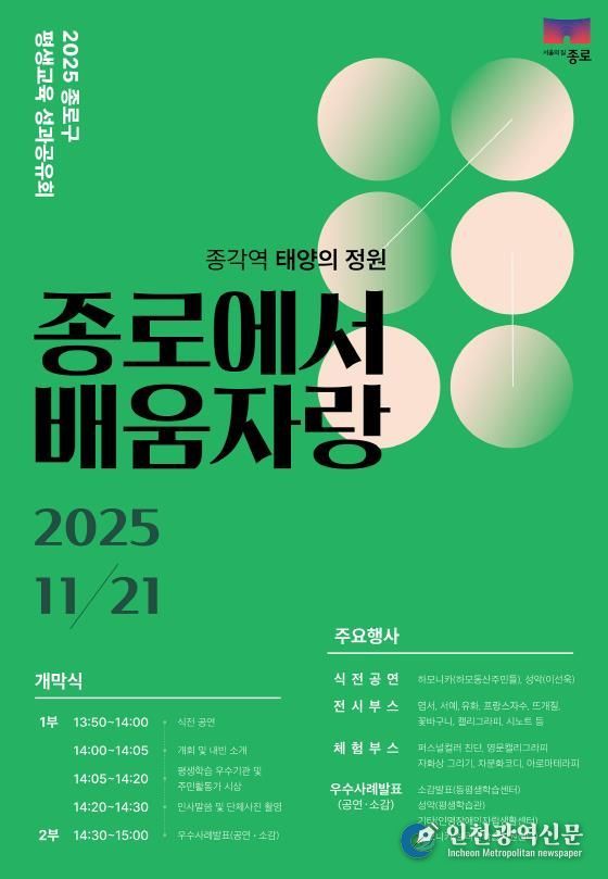 [인천광역신문] 기자 | 종로구가 11월 21일 12시부터 16시까지 종각역 태양의 정원에서 '평생교육 성과공유회'를 개최한다.