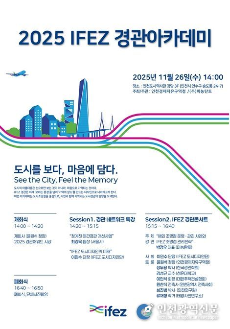 [인천광역신문] 최예준 기자 | 인천경제자유구역청은 오는 26일 인천도시역사관에서 ‘도시를 보다, 마음에 담다(See the City, Feel the Memory)’를 주제로 2025 IFEZ 경관아카데미를 개최한다고 밝혔다.