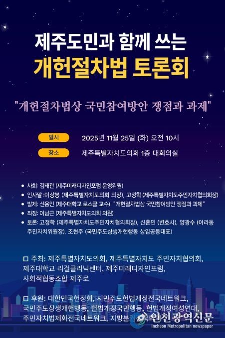 [인천광역신문] 관리자 기자 | 제주특별자치도의회, 제주특별자치도 주민자치위원회협의회, 제주대학교 리걸클리닉센터, 제주미래디자인포럼, 사회적협동조합 제주로 공동 주최로 11월 25일 오전 10시, 제주특별자치도의회 1층 대회의실에서 '제주도민과 함께 쓰는 개헌절차법 토론회'를 개최한다.