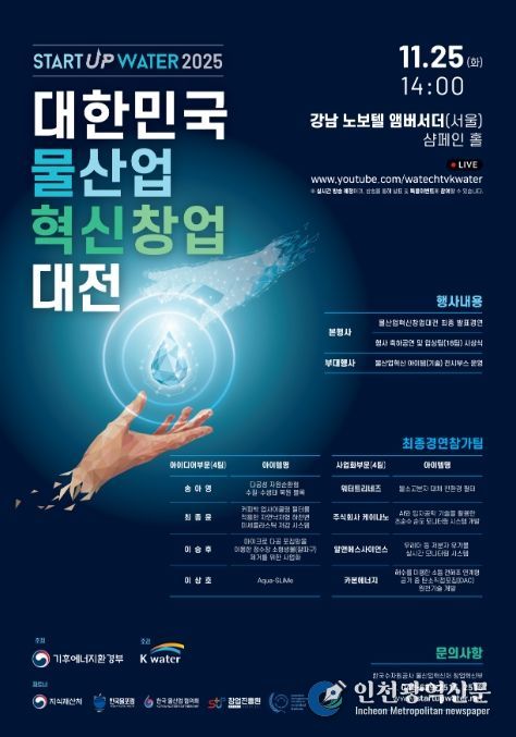 [인천광역신문] 관리자 기자 | 기후에너지환경부와 한국수자원공사는 물산업을 우리나라의 새로운 성장동력으로 성장시킬 ‘혁신형 고성장 기업(유니콘)’을 발굴하기 위해 11월 25일 노보텔앰버서더호텔(서울 강남구 소재)에서 ‘대한민국 물산업 혁신 창업대전 2025’ 최종 경연을 개최한다고 밝혔다.