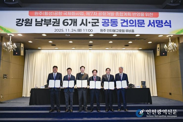 [인천광역신문] 관리자 기자 | 강원 남부권 6개 시군(원주·횡성·영월·평창·정선·태백)은 24일 오전 11시, 호텔인터불고 원주에서 국토교통부의 ‘제7차 공항개발 종합계획’에 ‘원주(횡성)공항의 국제화 사업 반영’을 요청하는 공동 건의문을 채택했다.