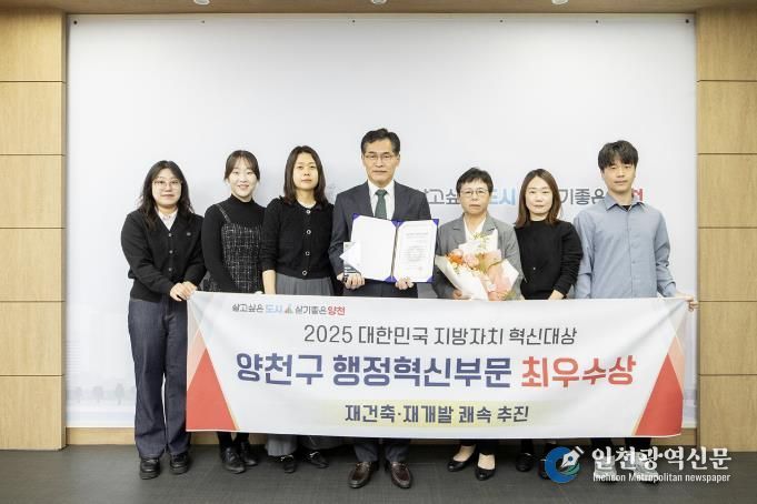 [인천광역신문] 기자 | 양천구는 장기간 답보 상태였던 도시정비사업을 전문성과 추진력으로 속도감 있게 이끈 성과를 인정받아 ‘2025 대한민국 지방자치 혁신대상’에서 행정혁신 부문 최우수상을 받았다고 25일 밝혔다. 지난해 도시혁신 부문 최우수상에 이어 2년 연속 우수기관으로 선정되는 성과다.