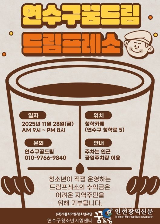 [인천광역신문] 최예준 기자 | 연수구학교밖청소년지원센터 ‘꿈드림’은 오는 28일 청학카페(청학로 5)에서 학교 밖 청소년이 직접 운영하는 일일 카페 ‘드림프레스’를 연다.