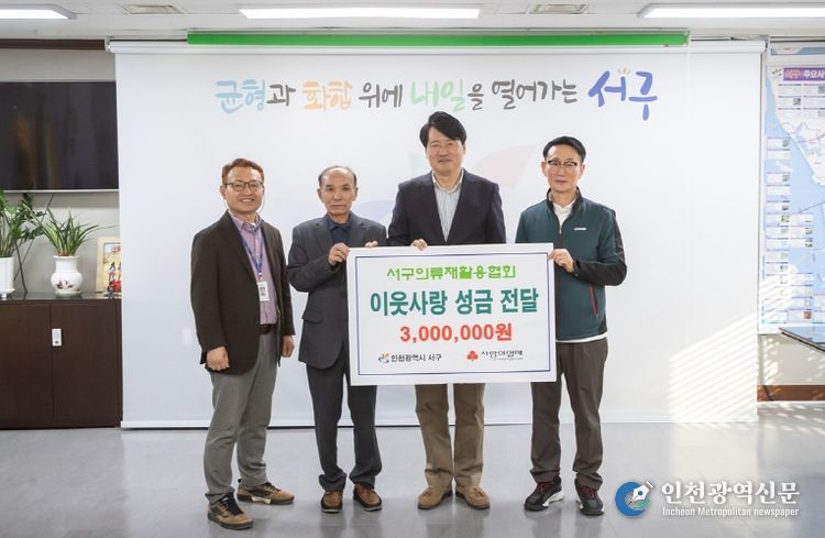 [인천광역신문] 최예준 기자 | 인천시 서구는 지난 24일 서구의류재활용협회(회장 나광수)로부터 이웃돕기 성금 300만 원을 기탁받았다고 밝혔다.