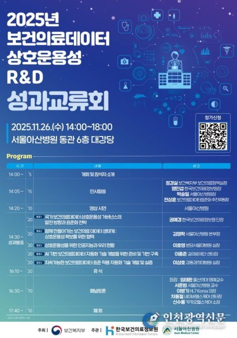 [인천광역신문] 관리자 기자 | 보건복지부가 주최하고 한국보건의료정보원(원장 염민섭)이 주관하는 '보건의료데이터 상호운용성 R&D 성과교류회'가 11월 26일 서울아산병원(서울 송파구 소재) 대강당에서 개최됐다.
