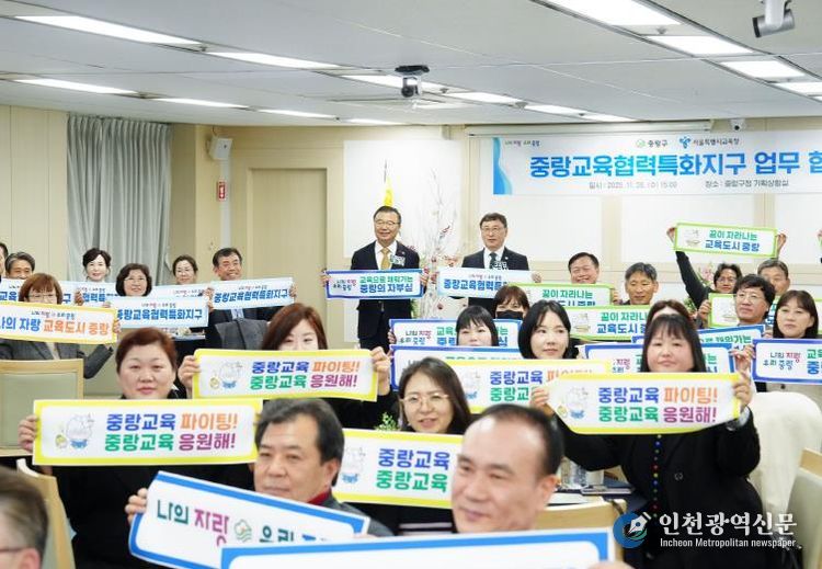 [인천광역신문] 관리자 기자 | 중랑구는 11월 26일 구청 4층 기획상황실에서 서울특별시교육청과 ‘중랑교육협력특화지구’업무협약을 체결했다. 이번 협약은 2019년 혁신교육지구, 2023년 미래교육지구 추진에 이어 지역 교육 협력사업을 확장하는 단계로, 구·교육청·학교 간 협력 구조를 체계화해 지역 기반 교육 환경을 강화하기 위해 마련됐다.