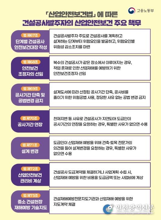 또한, 전국 지방노동관서장의 발주 공공기관장을 대상으로 한 재해 예방 지도 및 현장 점검 등의 활동과 지방정부, 한국산업안전보건공단, 민간재해예방기관, 관련 협회 등과 연계한 홍보·예방 활동을 병행하여, 산업현장의 안전 의식을 강화하는 등 현장 체감도를 높여 나갈 계획이다.