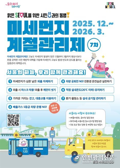 [인천광역신문] 기자 | 서울시는 ▴공공 및 고배출 교통부문에 대한 선제적 운행관리 강화 ▴시민·사업장 참여 기반의 현실적인 감축 체계 구축 ▴생활권 중심의 미세먼지 노출 최소화 관리 강화를 목표로 12월 1일부터 내년 3월 31일까지 ‘제7차 미세먼지 계절관리제’를 시행한다.