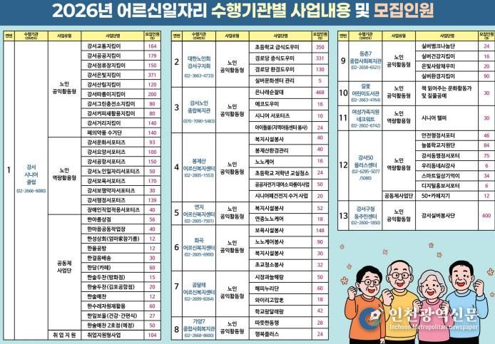 [인천광역신문] 기자 | 서울 강서구가 ‘2026년 어르신일자리 및 사회활동 지원사업’ 참여자 6,083명을 오는 12일까지 모집한다.