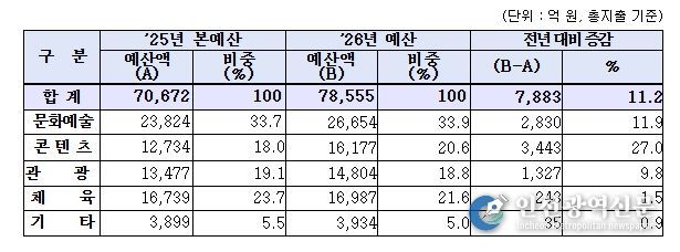 [인천광역신문] 관리자 기자 | 문화체육관광부는 2026년도 문체부 예산이 7조 8,555억 원으로 최종 확정되었다고 밝혔다. 이는 올해 본예산 대비 7,883억 원(11.2%)이 증가한 규모이다. 문체부는 이번 예산을 ‘케이-컬처’ 300조 원 시대 출발을 위한 예산으로 콘텐츠산업의 국가전략산업화, 국민이 함께 누리는 관광 등에 주력해 편성했다고 밝힌 바 있다.