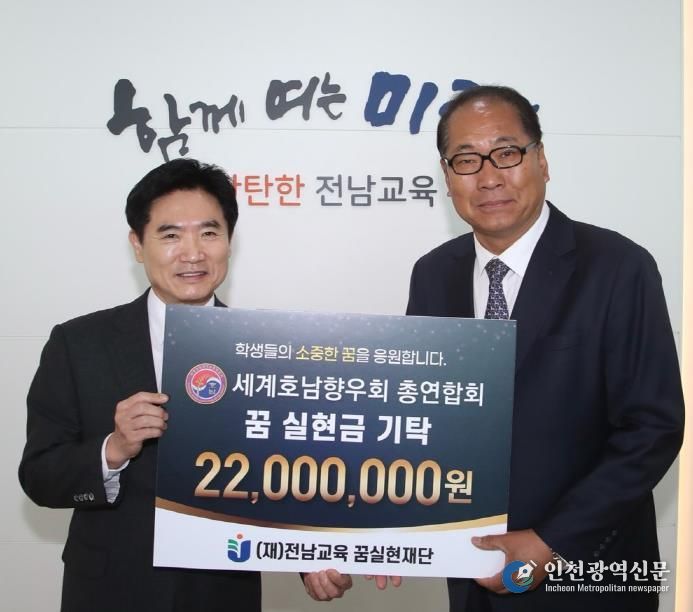 [인천광역신문] 관리자 기자 | 전남교육 꿈실현재단은 지난 1일 세계호남향우회 총연합회가 ‘전남 의(義) 실천 꿈 실현금’ 2,200만원을 기탁했다고 밝혔다.