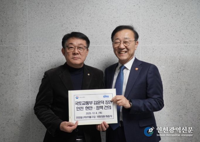 [인천광역신문] 관리자 기자 | 더불어민주당 허종식 의원(국회 기후에너지환경노동위·인천 동구미추홀구갑)이 4일 국회에서 김윤덕 국토교통부 장관을 만나 ‘인천 지역 국토·교통 현안 건의서’를 전달하고, 정부 차원의 적극적인 대책 마련을 촉구했다.