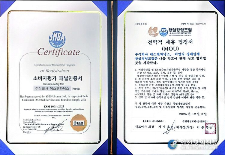 [인천광역신문] 관리자 기자 | 국내 중소기업의 글로벌 진출을 위한 새로운 협력 모델이 탄생했다. (주)에스앤파낙스(대표 서정호)는 최근 싱가폴 법인 팍스글로벌(PAX Global, 대표 다니엘 서)과 전략적 투자 및 사업 협력을 위한 양해각서(MOU)를 체결하며 아시아 시장 공략에 본격 시동을 걸었다.
