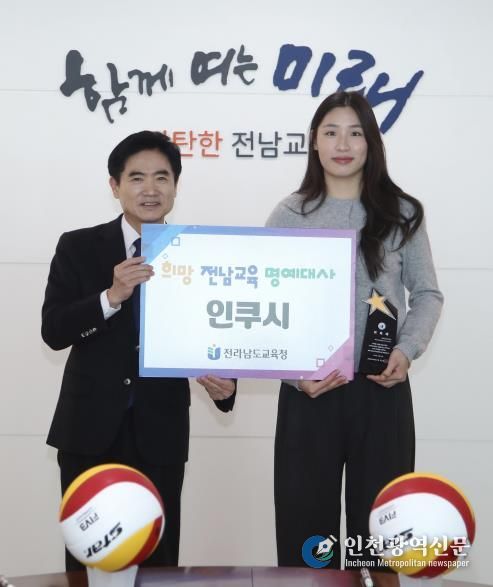 [인천광역신문] 관리자 기자 | 전남교육이 배출한 몽골 출신 배구선수 인쿠시가 ‘희망 전남교육 명예대사’에 위촉돼 다문화 이해와 국제 교류의 상징으로 전남 학생들의 희망 멘토 역할을 수행하게 된다.