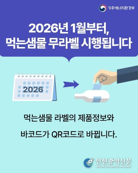 [인천광역신문] 관리자 기자 | 기후에너지환경부는 12월 11일 오후 서울역삼경교육센터(서울 용산구 소재)에서 2026년 1월 1일부터 시행되는 먹는샘물 상표띠 없는(무라벨) 제도가 현장에서 안정적으로 자리 잡을 수 있도록 먹는샘물 관련 업계와 종합 간담회를 개최한다고 밝혔다.
