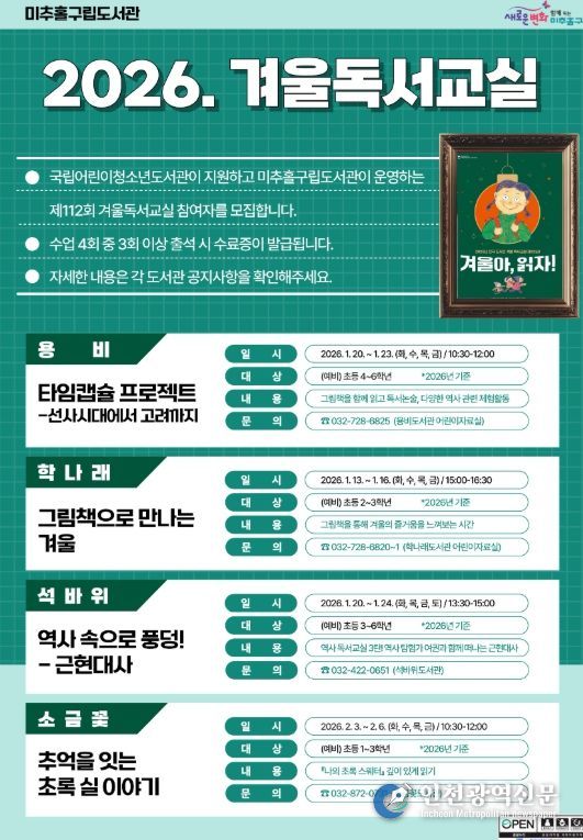 [인천광역신문] 최예준 기자 | 인천 미추홀구 구립도서관은 2026년 겨울방학을 맞아 관내 어린이를 대상으로 ‘겨울 독서 교실’과 ‘겨울방학 특강’을 운영한다고 16일 밝혔다.