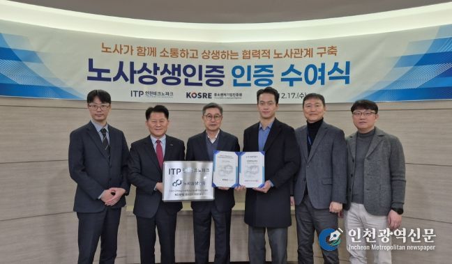 [인천광역신문] 최예준 기자 | 인천테크노파크(인천TP)는 노사 간 협력과 소통, 근로환경, 복리후생 운영 등 기관의 조직문화 전반을 종합적으로 평가해 부여되는 ‘노사상생인증’을 획득했다고 17일 밝혔다.