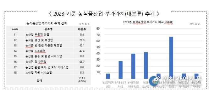 그간 농업 부가가치는 주로 쌀·채소·과일·축산업 등 1차 생산물 중심으로 집계되어 전 산업의 1% 수준에 불과한 것으로 알려져 왔으나, 연구 결과에 따르면 투입재를 비롯한 농산물의 가공·포장·유통 등 연관 산업과 스마트농업, 반려동물산업 등 신산업을 포함하면 그 비중이 ’23년 기준으로 전체 산업의 8.9% 수준, 부가가치 규모도 211조 원에 달하는 것으로 나타났다.