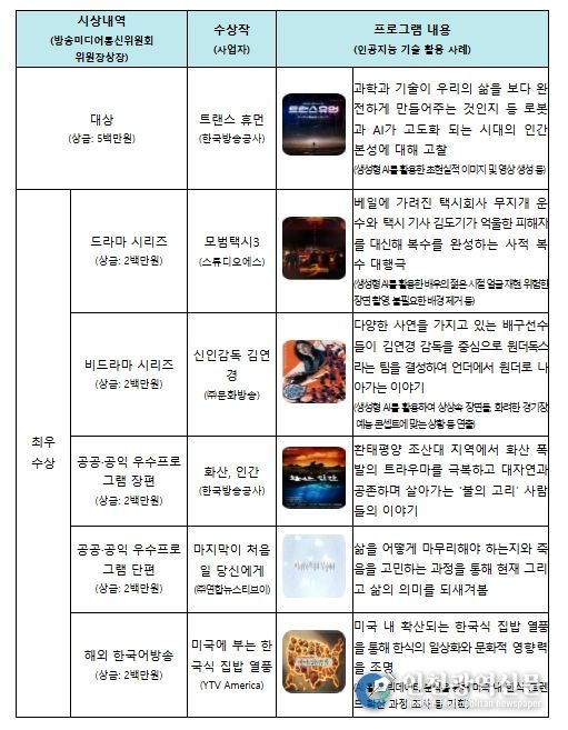 인공지능과 로봇 기술이 인간 정체성에 미치는 영향을 탐구한 한국방송공사(KBS)의 ‘트랜스 휴먼’이 대상을, ▲모범택시3(드라마) ▲신인감독 김연경(비드라마) ▲화산, 인간(공공‧공익 장편) ▲마지막이 처음일 당신에게(공공‧공익 단편) ▲미국에 부는 한국식 집밥 열풍(해외 한국어방송)이 최우수상을 수상했다.