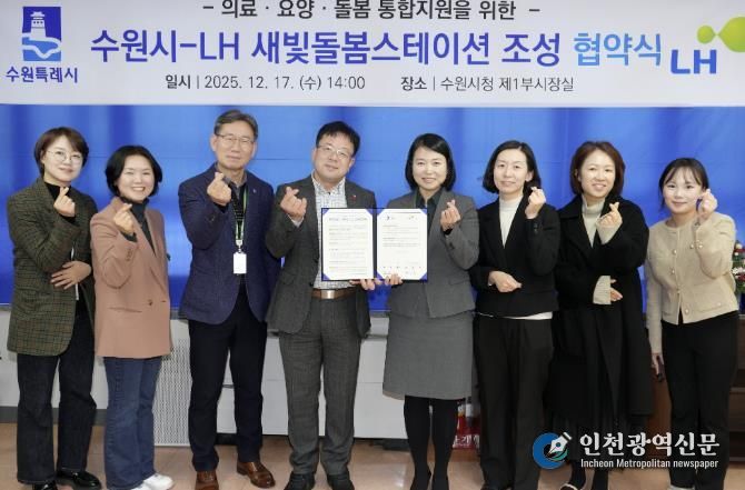 수원시와 LH는 17일 수원시청에서 새빛돌봄스테이션 조성 업무협약을 체결하고, 협력을 약속했다. 협약식에는 김현수 제1부시장, LH 경기남부지역본부 강보람 주거복지사업처장 등이 참석했다.